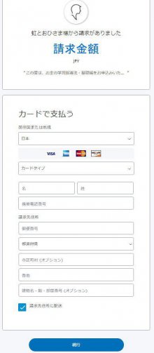 - 画面最下部の【会員登録せずに支払う】をクリックして、有効なクレジットカード情報を入力すれば、こちらの画面が表示されます。