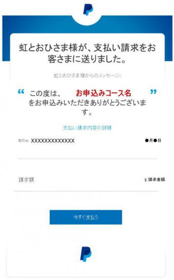 お申込みフォームからお申込み後、2営業日内にお支払い用URLをPayPalメールでお送りしますので、決済ページへ移動してください。