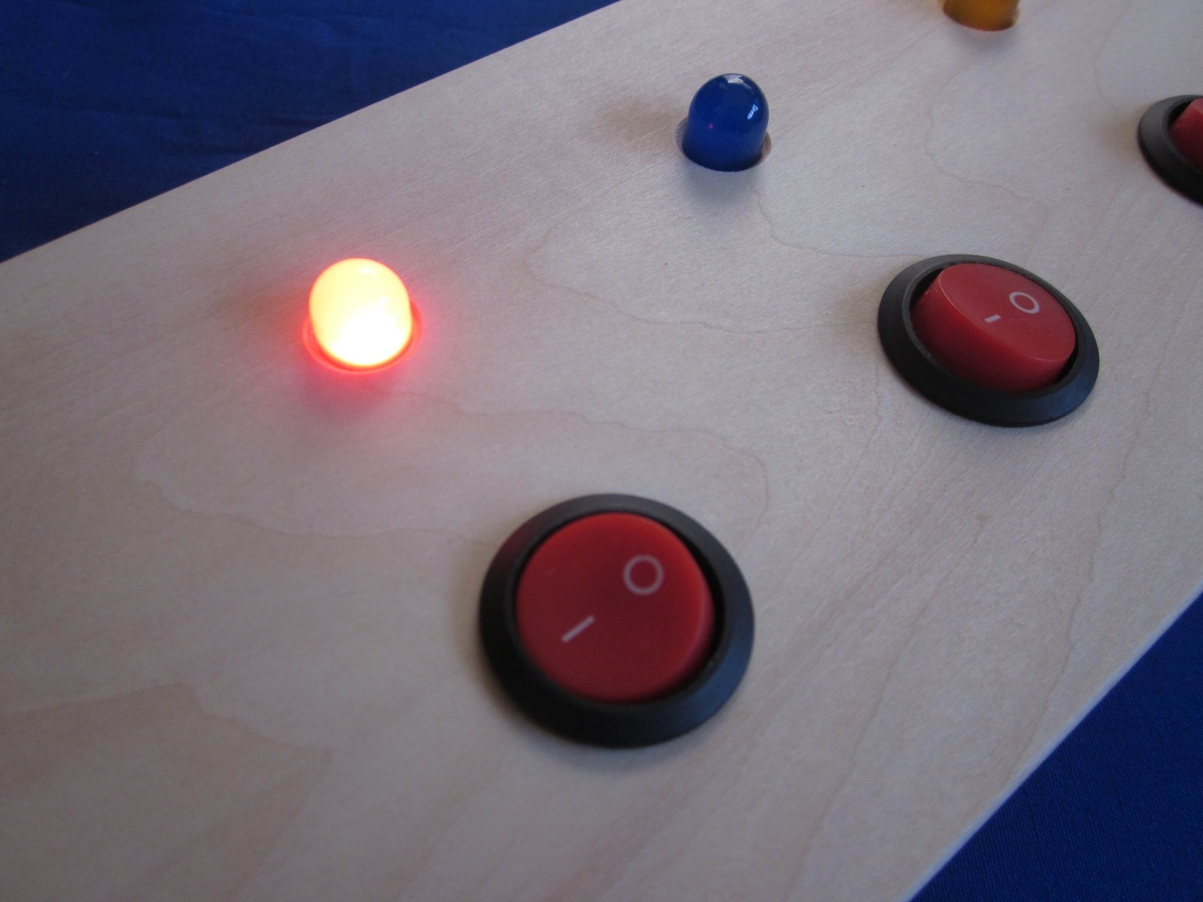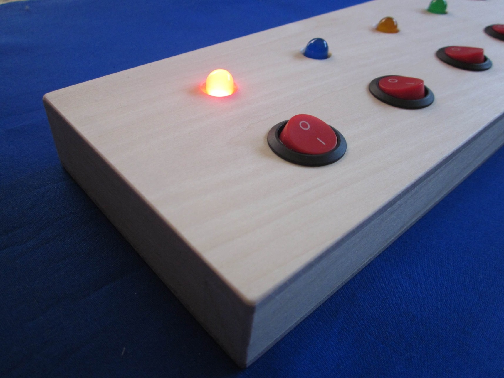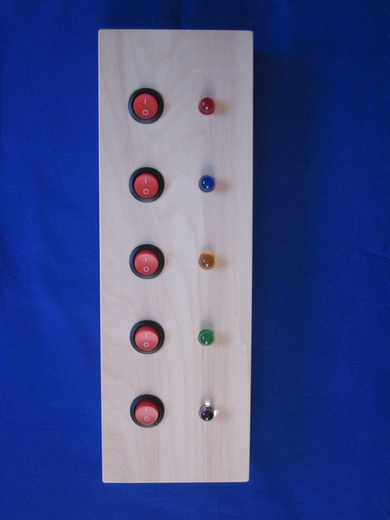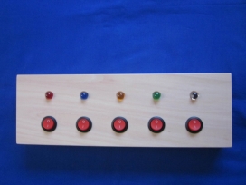 5つのボタンと5つのランプで、指先の訓練や数の勉強がこれ一つでできる優れものです。